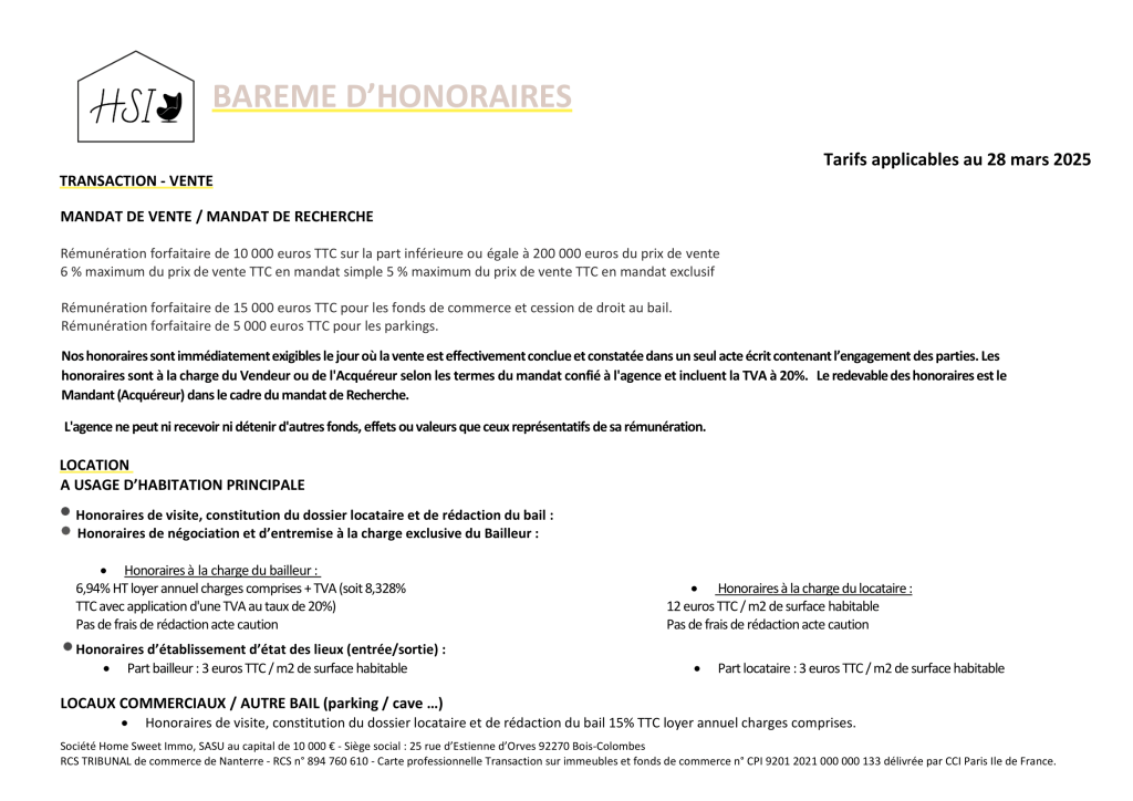 honoraires sont à la charge du Vendeur ou de l’Acquéreur selon les termes du mandat confié à l’agence et incluent la TVA à 20%. Le redevable des honoraires est le